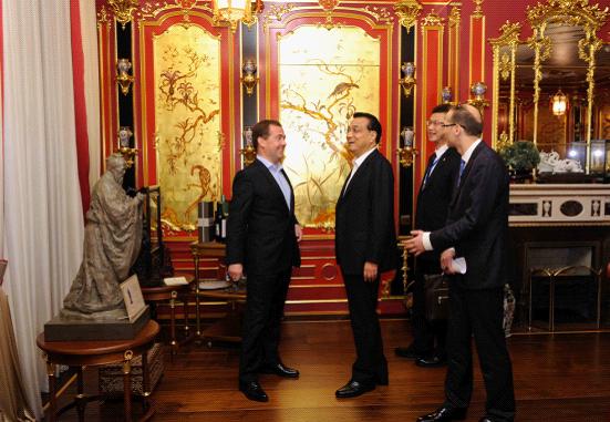夕阳西下,秋意阑珊。梅德韦杰夫早早在官邸门口迎候克强总理,并请他来到金碧辉煌的“中国厅”用餐。
