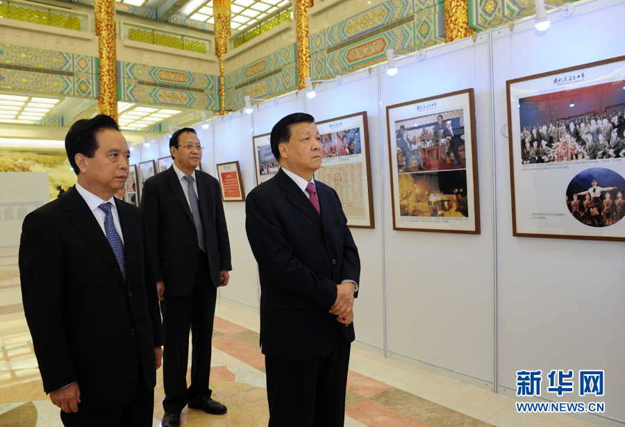 10月29日,中国国际文化交流中心成立30周年纪念大会在北京召开。中共中央政治局常委、中央书记处书记刘云山参观文化中心制作的《我们走过三十年》图片展并会见纪念大会与会代表。新华社记者 饶爱民 摄