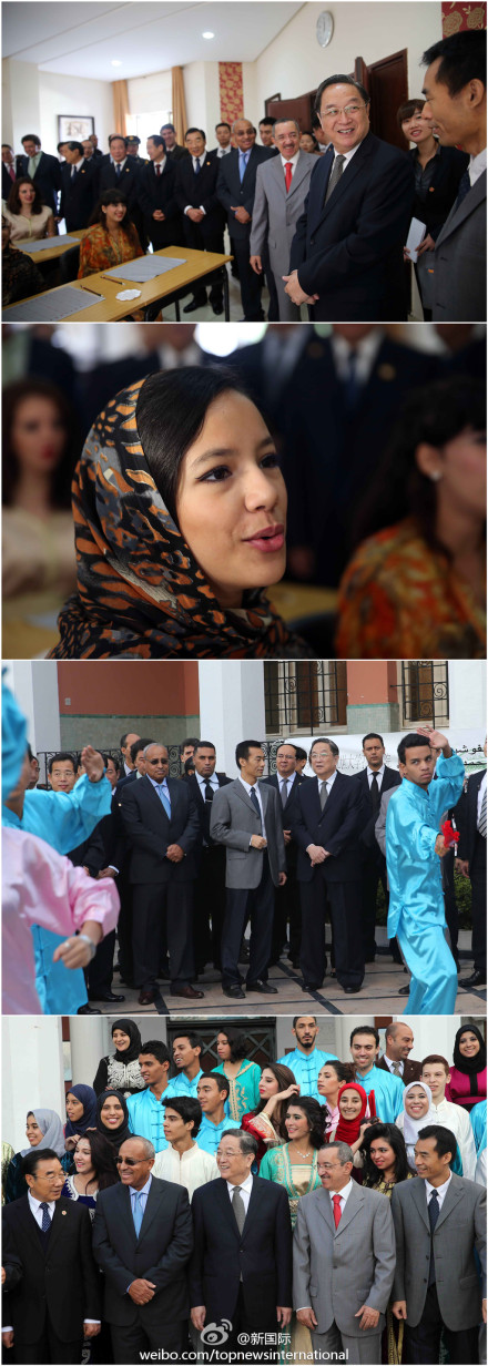 新华网北京11月6日电 据新华社“新国际”微博报道,全国政协主席俞正声5日参观摩洛哥穆罕默德五世大学孔子学院,身着摩中两国民族服装的当地学生诵唐诗、打太极、跳《小苹果》欢迎。俞正声走进课堂对学生说:“你们是中摩友好的未来。希望大家用心学好中文,促进合作交流。” (记者李拯宇 摄影刘卫兵)