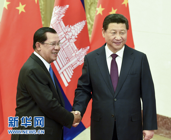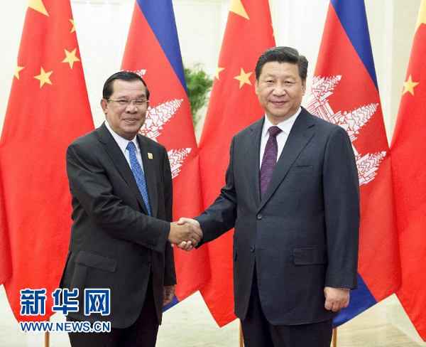习近平欢迎洪森来华出席加强互联互通伙伴关系对话会。习近平指出,路遥知马力,日久见人心。中柬两国坚持做知心朋友和可靠伙伴,风雨同行,携手合作。这种传统友谊弥足珍贵,我们要坚定不移予以坚持和发展,使中柬关系不断向前发展,结成守望相助的命运共同体。中方支持洪森首相和人民党领导柬埔寨走符合本国国情的发展道路,将继续为柬埔寨经济社会发展提供帮助。中方愿意同柬方保持高层往来和党际交往,交流治国理政经验,推进互联互通、农业、水电、经济特区、教育、医疗、电信、旅游等领域合作,共同推进丝绸之路经济带和21世纪海上丝绸之路建设。中方支持加强两国人文和青年交流,使中柬友谊不断发扬光大。双方要在地区事务中加强沟通和协调,共同维护和促进中国-东盟团结合作。