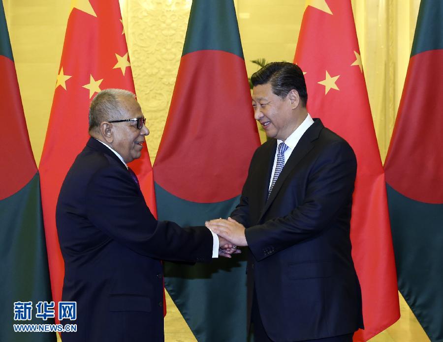 习近平欢迎哈米德来华出席加强互联互通伙伴关系对话会。习近平指出,中孟两国之间只有友谊、信任、合作。中方赞赏孟方在涉及中方核心利益问题上给予的支持,将一如既往支持孟方维护独立和主权,实现稳定和发展,推动两国更加紧密的全面合作伙伴关系不断取得新成果。丝绸之路经济带和21世纪海上丝绸之路建设为两国合作带来新机遇。双方要以庆祝明年建交40周年为契机,加强贸易、农业、基础设施建设、海洋等领域合作,深化传统友谊。孟加拉国是中国在南亚和印度洋地区重要合作伙伴,双方要共同推动孟中印缅经济走廊建设。中方欢迎孟方作为创始成员国加入亚洲基础设施投资银行。