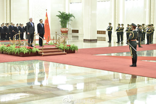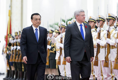 新华社北京11月8日电 据新华社“新华视点”微博报道,8日下午,国务院总理李克强在人民大会堂北大厅举行仪式,欢迎来华进行正式访问的加拿大总理斯蒂芬·哈珀。