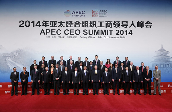 亚太经合组织工商领导人峰会开幕式前,国家主席习近平同与会亚太工商界代表合影。鞠鹏摄影