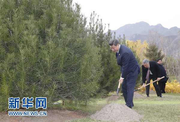 11月11日,中国国家主席习近平与出席2014年亚太经合组织领导人非正式会议的各成员经济体领导人、代表共植APEC亚太伙伴林。新华社记者鞠鹏摄