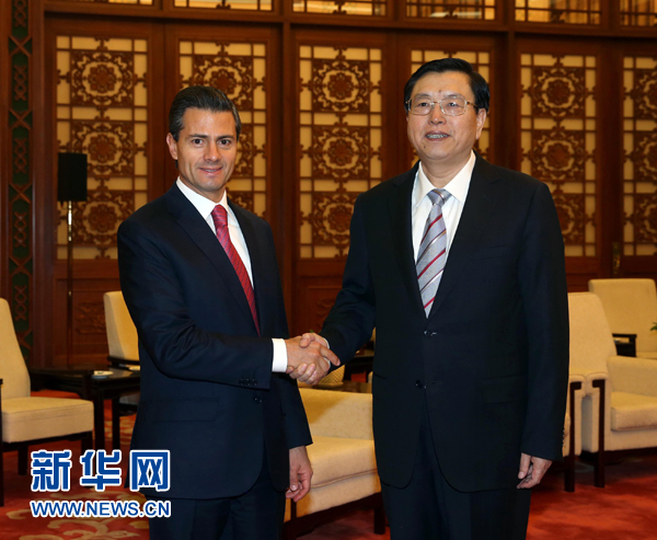 张德江说,中墨同为重要新兴国家,两国共同利益多,合作前景广。去年双方建立中墨全面战略伙伴关系,有力地推动了各领域合作发展。此访期间,习近平主席与总统先生达成新的重要共识,体现出双方在高度互信基础上加强合作的强烈愿望。中国全国人大将与墨西哥国会共同努力,深化立法机关友好关系,加强治国理政经验交流,营造务实合作法律环境,夯实民意和社会基础,为落实两国元首达成的共识、推动中墨全面战略伙伴关系实现新的更大发展作出积极贡献。
