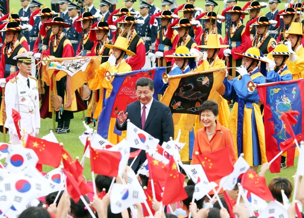 (7月3日,国家主席习近平在首尔同韩国总统朴槿惠举行会谈。会谈前,朴槿惠在青瓦台总统府为习近平举行隆重欢迎仪式。 摄影 姚大伟)