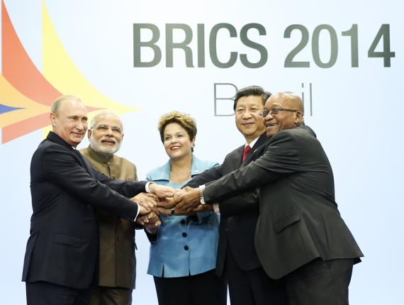 (7月15日,国家主席习近平在巴西福塔莱萨出席金砖国家领导人第六次会晤并发表重要讲话。这是习近平同出席会晤的巴西总统罗塞夫、俄罗斯总统普京、印度总理莫迪、南非总统祖马合影。摄影 兰红光)