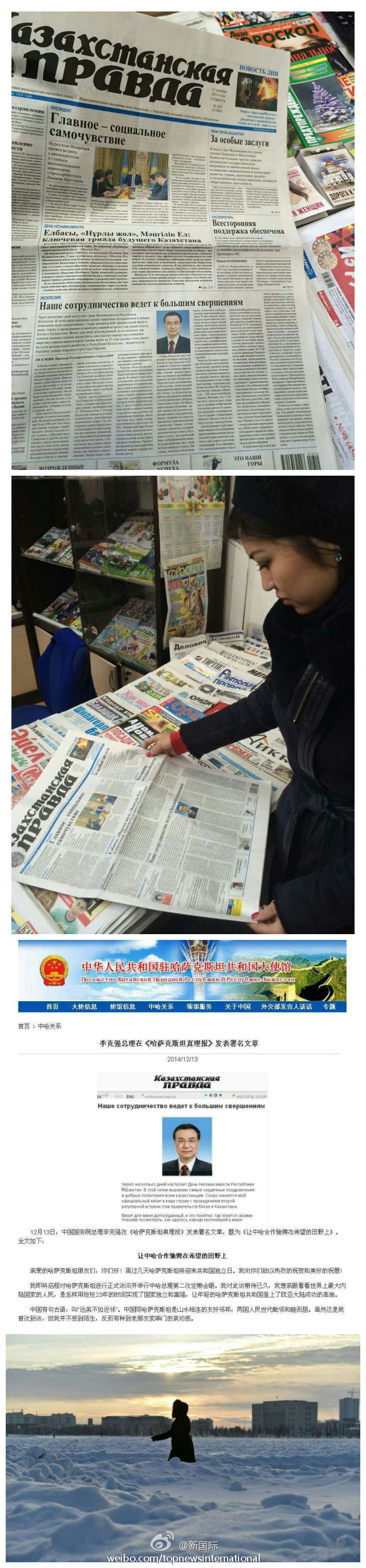新华社北京12月13日电 据新华社“新国际”微博报道,哈萨克斯坦真理报13日头版刊登李克强总理访前发表的署名文章《让中哈合作驰骋在希望的田野上》。总理表示,中哈是友好邻邦,历史渊源深厚,战略互信不断加深,利益融合愈加紧密,他对中哈合作未来充满信心。李克强还就即将到来的哈萨克斯坦独立日向当地民众致以祝贺和祝愿。