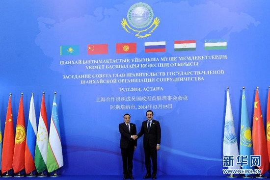 12月15日,中国国务院总理李克强在阿斯塔纳出席上海合作组织成员国政府首脑理事会第十三次会议。这是哈萨克斯坦总理马西莫夫迎接李克强。新华社记者 饶爱民 摄