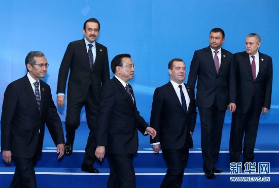 12月15日,中国国务院总理李克强在阿斯塔纳出席上海合作组织成员国政府首脑理事会第十三次会议。这是与会领导人集体合影后走向会场。新华社记者 庞兴雷 摄