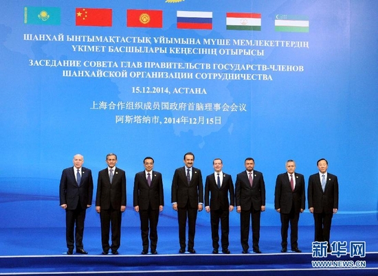 12月15日,中国国务院总理李克强在阿斯塔纳出席上海合作组织成员国政府首脑理事会第十三次会议。这是与会领导人集体合影。 新华社记者饶爱民 摄
