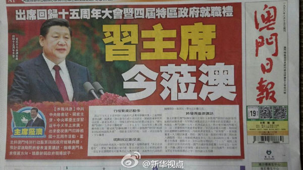 新华社北京12月19日电 据新华社“新华视点”微博报道,12月的澳门天气转凉,节日的澳门热情洋溢。中共中央总书记、国家主席、中央军委主席习近平于12月19日至20日赴澳门出席庆祝澳门回归祖国15周年大会暨特区第四届政府就职典礼。今早,澳门细雨霏霏,空气格外清新。澳门各界正热切盼望着习主席的到来。(记者霍小光、李寒芳)