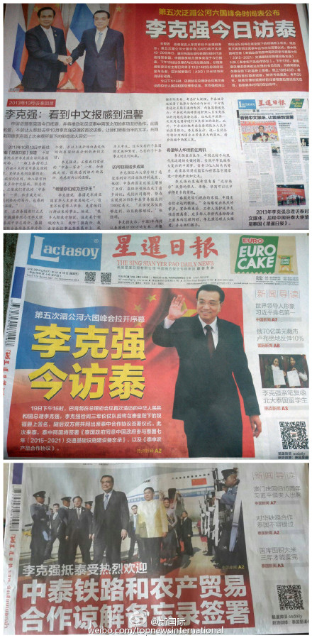 新华网北京12月20日电 据新华社“新国际”微博报道,泰国媒体纷纷在头版头条位置对李克强总理的泰国之行予以报道,社会各界高度关注。泰国《星暹日报》在头版刊登总理大幅照片,称总理此行将推动和见证中泰两国之间签署多份友好合作协议,并回顾了2013年李克强总理访泰时的情景。