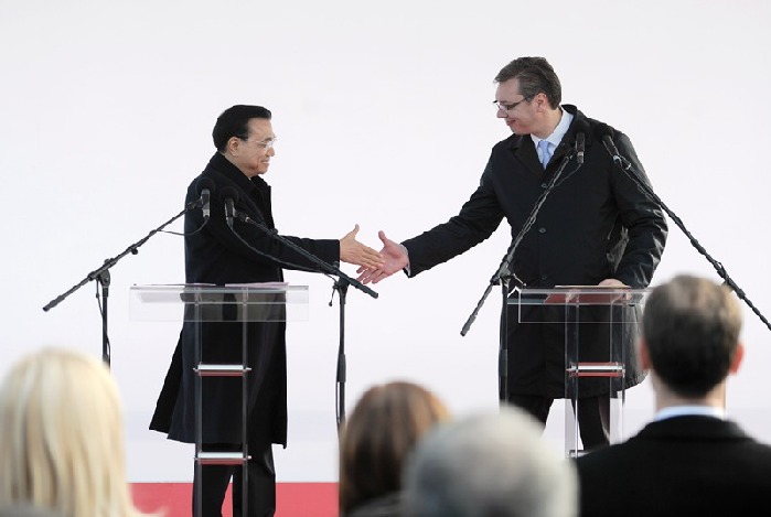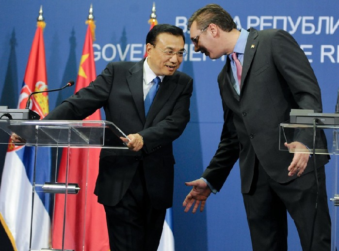 李克强与塞尔维亚总理武契奇共见记者。中新社 刘震 摄