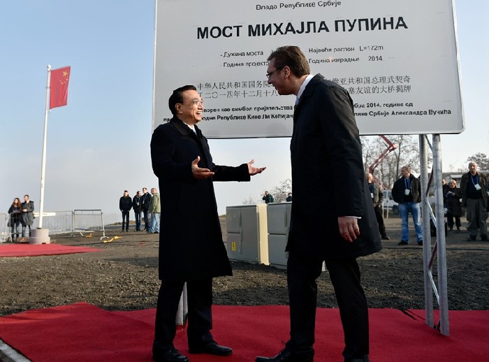 李克强与塞尔维亚总理武契奇出席贝尔格莱德跨多瑙河大桥竣工仪式。中新社 刘震 摄