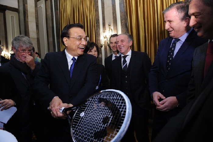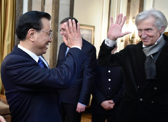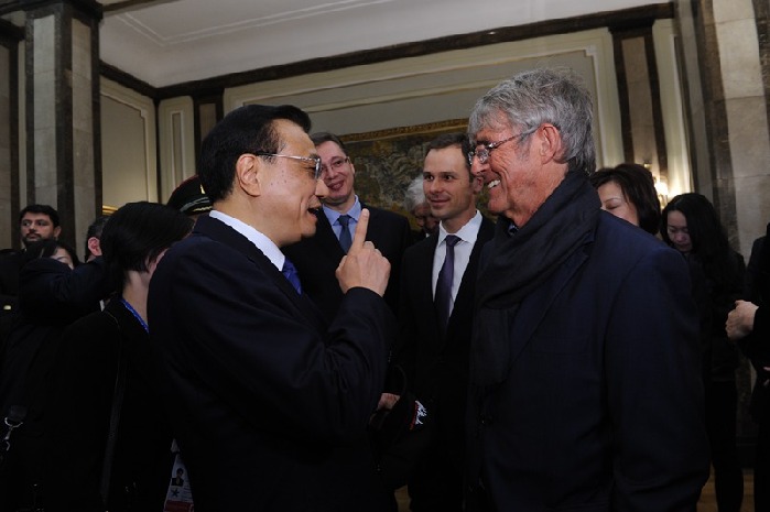 李克强与电影《瓦尔特保卫萨拉热窝》中“吉斯”的扮演者“对暗号”。中新社 刘震 摄