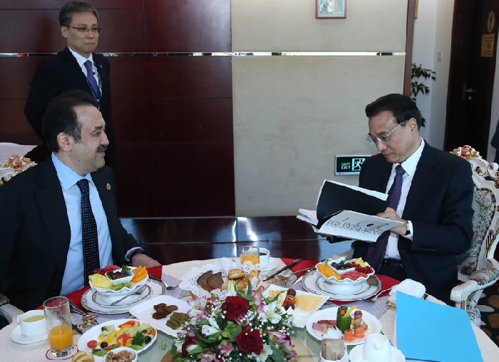 李克强与哈萨克斯坦总理马西莫夫共进早餐。新华社 庞兴雷 摄