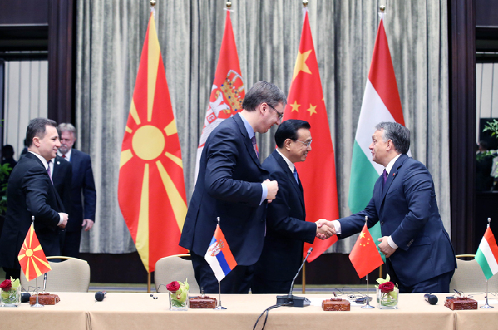 李克强与塞尔维亚、匈牙利、马其顿三国总理共见记者。新华社 姚大伟 摄