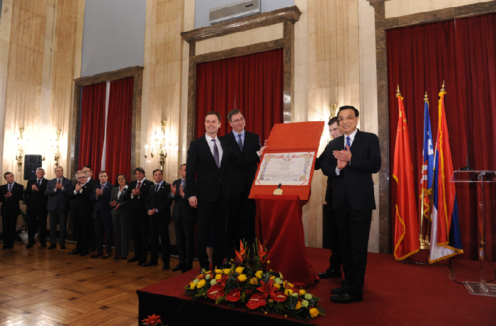 李克强被授予贝尔格莱德荣誉市民。新华社 饶爱民 摄
