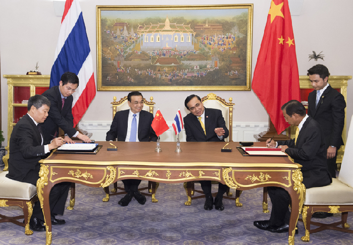 李克强与泰国总理巴育共同见证中泰铁路合作备忘录签署。新华社 黄敬文 摄