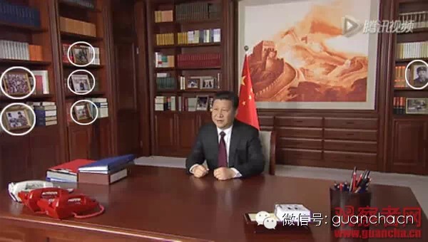 在他右手边的书架上,摆放了与去年不同的5张照片,经过观察者网小编的火眼金睛和仔细搜索终于找到了这5张照片,其中两张跟军队有关,两张是关于儿童的,还有一张是关于扶贫的。到底是哪几张,快点来看看(如下图所示1~5顺序)。