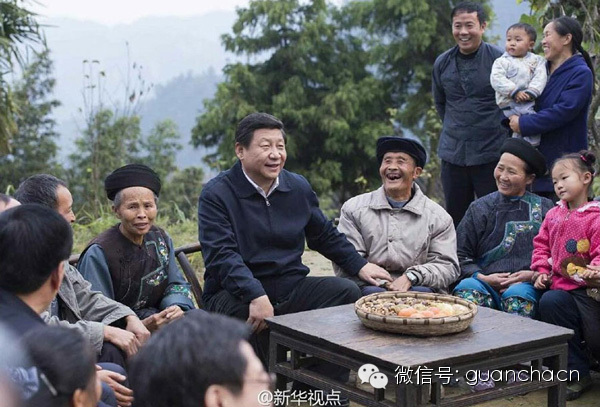 图3:2013年11月3日,习近平赴地处武陵山区中心地带的湘西土家族苗族自治州考察,调研当地扶贫攻坚情况,并深入当地少数民族村子的果园和特困户,了解居民的生活状况。