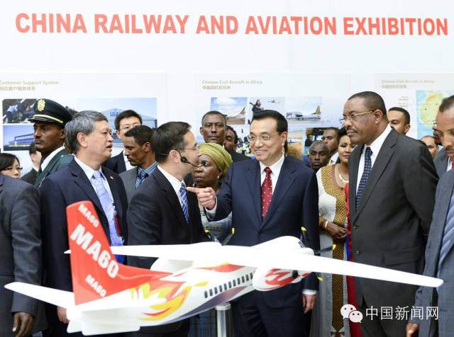 5月5日,李克强总理与埃塞俄比亚总理海尔马里亚姆、非洲联盟委员会主席祖马共同参观在亚的斯亚贝巴非盟会议中心举办的中国铁路航空展。海内外媒体称赞李克强为“超级推销员”。2014年他5次出访,带回的订单总计超过1400亿美元。