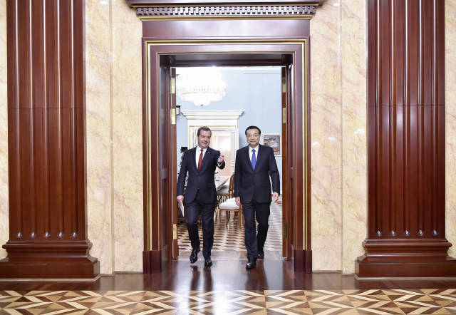 10月13日,李克强总理在莫斯科同俄罗斯总理梅德韦杰夫共同主持中俄总理第十九次定期会晤。