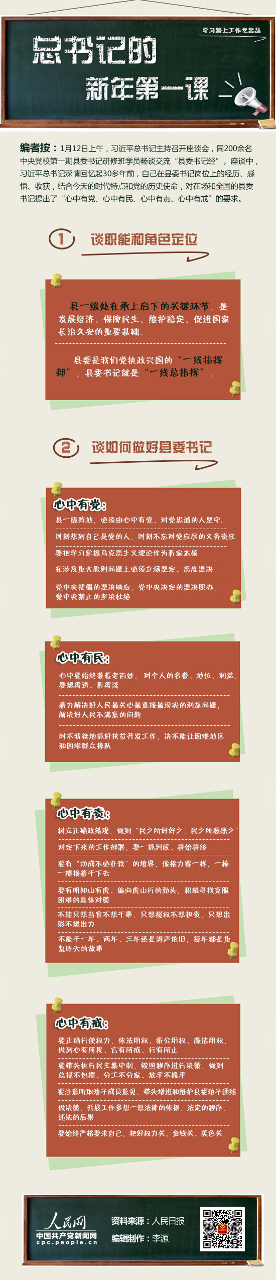 「学习路上按」1月12日上午,中共中央总书记、国家主席、中央军委主席习近平在人民大会堂主持召开座谈会,同200余名中央党校第一期县委书记研修班学员畅谈交流“县委书记经”。座谈中,习近平总书记深情回忆起30多年前,自己在县委书记岗位上的经历、感悟、收获,结合今天的时代特点和党的历史使命,对在场和全国的县委书记提出了“心中有党、心中有民、心中有责、心中有戒”的要求。