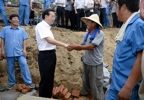 2014年10月24日,李克强总理在山东德州雨污分流管道铺设施工现场与农民工握手交谈