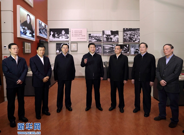 2012年11月29日,中共中央总书记、中央军委主席习近平和中央政治局常委李克强、张德江、俞正声、刘云山、王岐山、张高丽等来到国家博物馆,参观《复兴之路》展览。 新华社记者 兰红光 摄