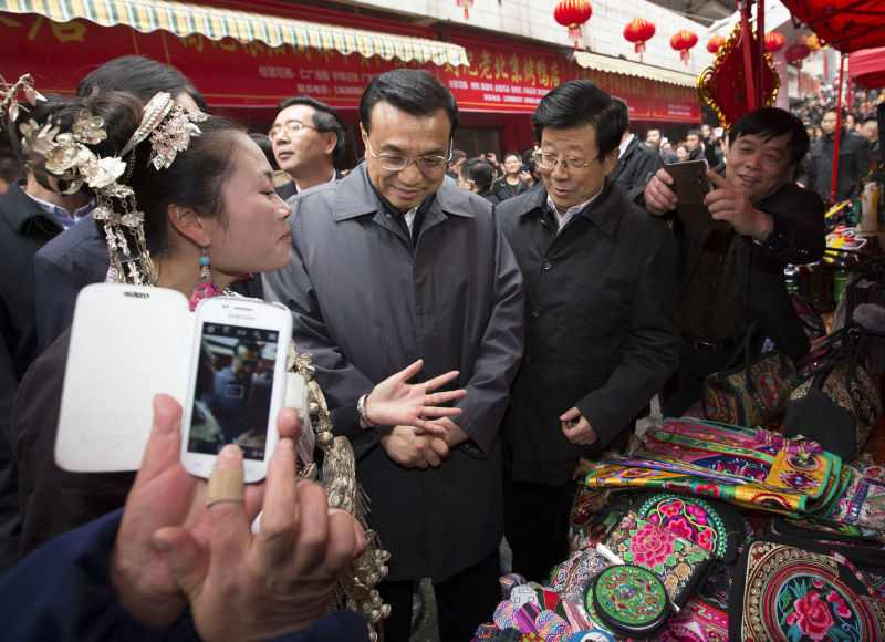 李克强来到黎平大市场考察节日供应。看到买卖兴隆、年味浓厚,他非常高兴,边走边与购物的群众和摊主交谈,并掏钱按当地习俗买了几包年货。李克强说,看群众生活好不好,这里就是一扇窗口。农村消费潜力很大,是扩内需的重要着力点。要千方百计让农民的钱包鼓起来,提供更加丰富、物美价廉的产品和服务,使农村市场旺起来,群众生活更红火。
