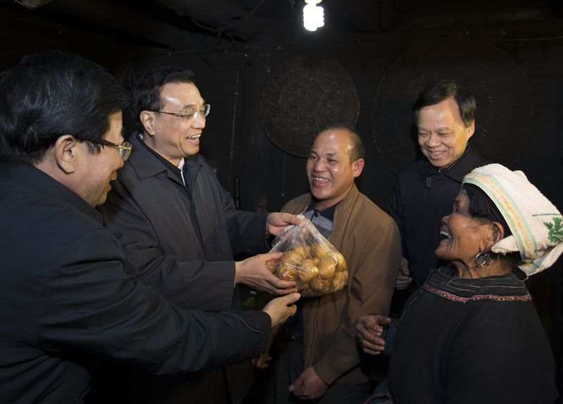 在喜迎新春佳节的日子里,李克强十分牵挂困难群众生活。他辗转来到大山深处的侗族贫困村蒲洞村,接连走进几家贫困户,查看家中存粮和饮水质量,询问还有哪些困难,并向他们送上在集市购买的年货。他还登上简陋的阁楼,了解房屋危险状况,看到村里还有不少房子透风漏雨,李克强神色凝重,他叮嘱随行负责同志说,这是“民生之痛”,一定要加快农村危房改造,努力让群众住得安全、温暖。在村卫生室,李克强详细了解村民就医、药品价格等情况。他对村医说,你们是最贴近群众的“白衣卫士”,国家要进一步提高广大村医收入,解除后顾之忧,让你们更安心地服务好农民。他指出,打好扶贫攻坚战,根本要靠发展。我们将持续加大对贫困地区道路、水利等基础设施投入,增加医疗卫生、生态保护等公共服务供给,这都是扶在根上、帮在点上的举措,广大干部要扑下身子,真抓实干,一起努力拔掉“穷根子”。