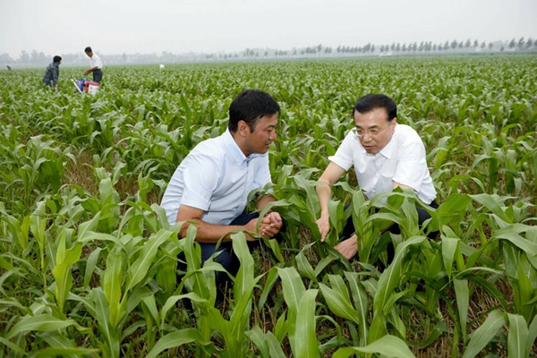 (2014年7月24日,李克强在德州陵县德强家庭农场考察。他深入田间地头,询问良种选取,察看滴灌追肥,触摸智能测土配方施肥电子系统,了解各种大型农用机械功用。)