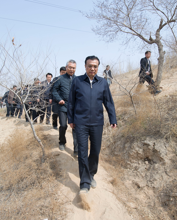 (2014年1月27日,李克强在旬阳县金坡村攀上陡坡,扒开土块查看旱情。他说,对这样的陡坡地,要下决心实施退耕还林,使生态得保护,农民得实惠。 )