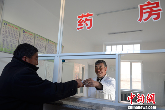 图为2015年2月13日,村医孟显森在新建的卫生室药房给村民拿药,今天他计划上门出诊6户人家。刘文华 摄