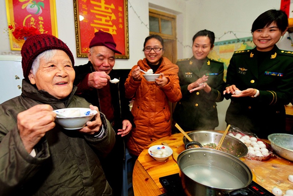 (2014年2月13日,福建,抗美援朝老战士吕仕林(左二)和老伴钟芳媛(左一)品尝着边防和边检官兵们为他们包的元宵,提前感受浓浓的元宵团圆气氛。新华社记者 魏培全 摄)