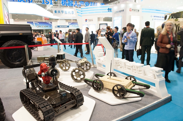 (2014年4月10日,重庆,第十一届中国重庆高新技术交易会暨第七届中国国际军民两用技术博览会上,一家军工企业展示的多用途智能机器人。新华社记者 刘潺 摄)