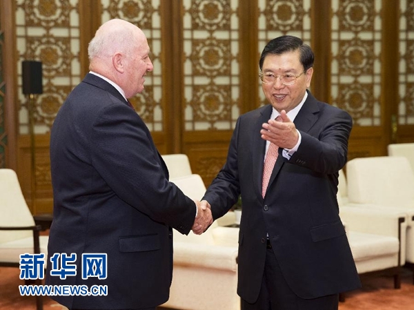 张德江说,中澳建交43年来,各领域合作水平不断提高,两国关系的战略性、务实性和全面性日益突出。去年11月,习近平主席访澳期间,双方把两国关系提升为全面战略伙伴关系。中方愿与澳方共同努力,牢牢把握两国关系发展的正确方向,相互尊重,求同存异,聚焦共同利益,拓展务实合作。近年来,中国全国人大与澳大利亚议会交往日益密切,应进一步深化交流合作,丰富合作内涵,举办好即将召开的中澳议会定期交流机制第六次会议,共同推动中澳全面战略伙伴关系向前发展。