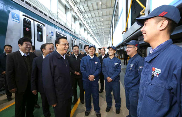 振兴升级装备制造业是稳增长、调结构的重要内容。在中国北车长春轨道客车公司,李克强详细了解企业技术研发和开拓市场情况,得知公司今年海外订单和利润继续较大幅度增长,李克强高兴地说,中国机车装备产业链条长,具有技术和劳动密集型的双重优势,不仅性价比高,走出去前景广阔,而且能够带动相关产业发展。特别是在产业成长过程中还能造就大量技术工人。要通过改革创新,整合技术、研发、制造、培训等资源,与对外基础设施合作相协同,打造中国装备走出去的“联合舰队”,参与国际市场合作竞争,提升企业核心竞争力,用中国装备走出去和开展国际产能合作的新成效,助力中国经济发展。
