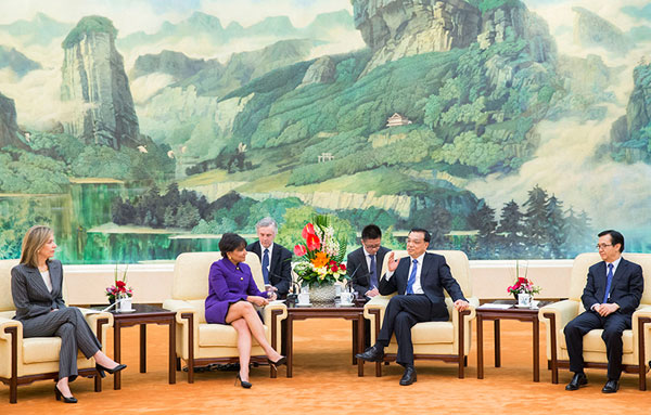 国务院总理李克强13日下午在人民大会堂会见美国总统代表、商务部长普利兹克和她率领的“总统贸易代表团”一行。