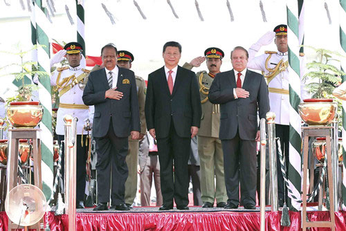 图为巴基斯坦总统侯赛因和总理谢里夫为习近平主席举行隆重欢迎仪式。兰红光摄