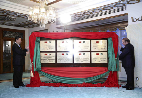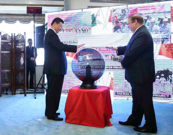 图为习近平主席与巴基斯坦总理谢里夫共同为两国合作项目揭牌。兰红光摄