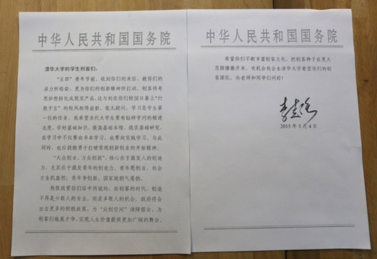人民网北京5月4日电 (记者 杨芳)2015年5月4日,在五四青年节到来之际,清华大学的学生创客们收到了一份特殊的青年节礼物——李克强总理的回信。总理在回信中,充分肯定了大学生创客们所具有的勇于打破常规创新创业的开拓精神,希望他们要有钻研学问的精进态度,不仅要向书本学习,也要向实践学习;不断丰富创客文化,把创客种子在更大范围播撒开来。总理的回信,字里行间渗透着党和国家对青年一代学生的充分信任和殷切期望,让清华大学学生创客们深受鼓舞。