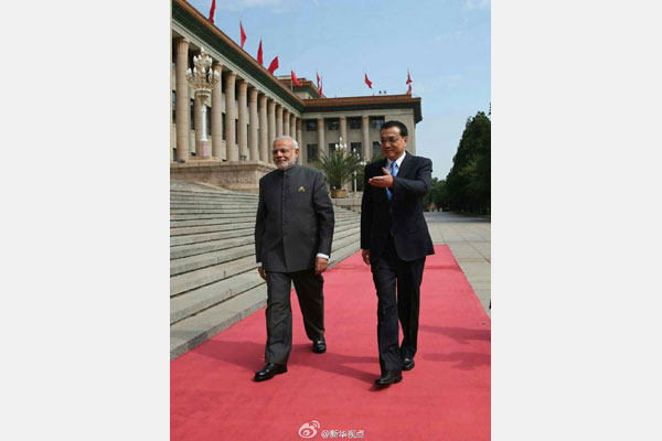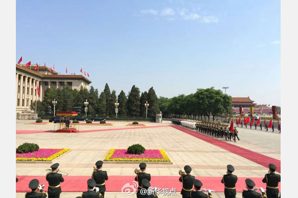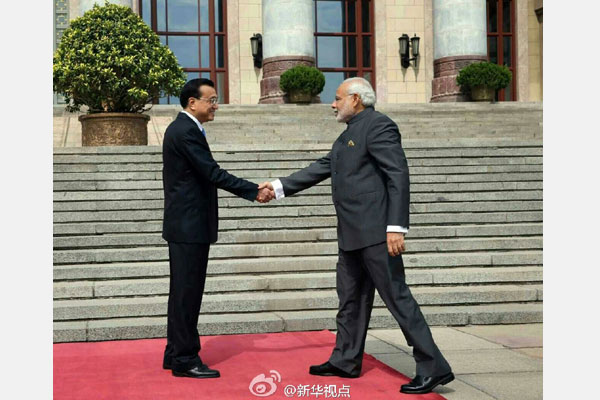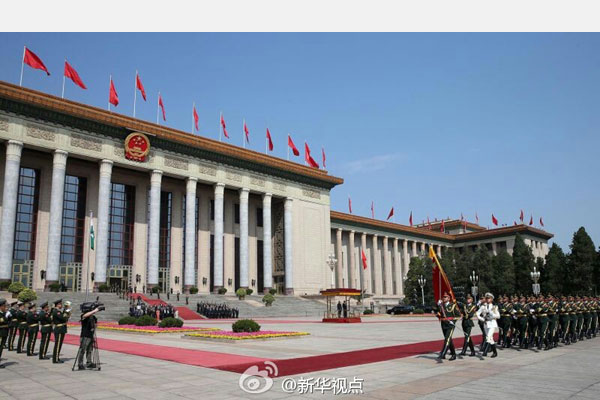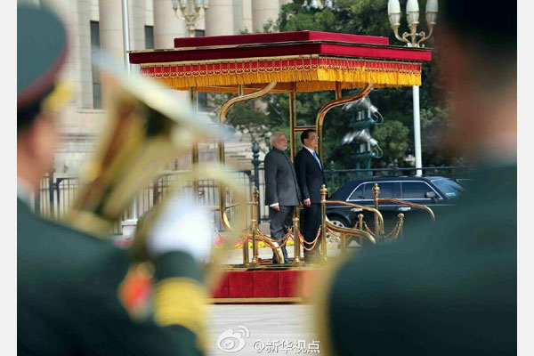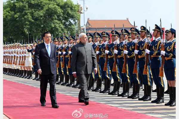 新华社北京5月15日电 据新华社“新华视点”微博报道,国务院总理李克强15日上午在人民大会堂东门外广场举行仪式,欢迎来华进行正式访问的印度总理莫迪。