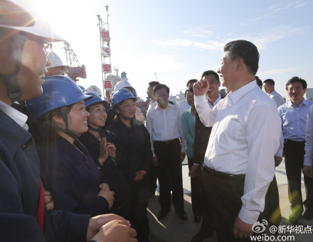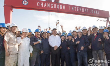 25日下午,习近平来到长宏国际船舶修造有限公司,登上30万吨级船坞平台,察看造船作业,了解企业生产和科技创新等方面的情况。他指着巨大的龙门吊说,大吊车真厉害,轻轻一抓就起来。他鼓励企业在国际竞争中抓住机遇,增强信心,拼搏向前。