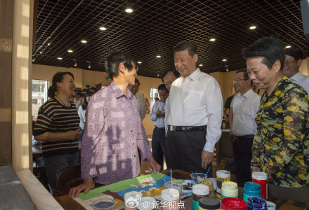 在舟山定海区新建社区群众艺术创作中心,村民向总书记展示了他们创作的渔民画和制作的手工艺品。习近平驻足欣赏并说,很有特色,很有味道。得知这些工艺美术品销路不错,成为村民收入重要来源,习近平对在村里做指导的老师说,你做了件很有意义的事情。