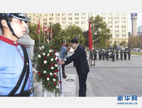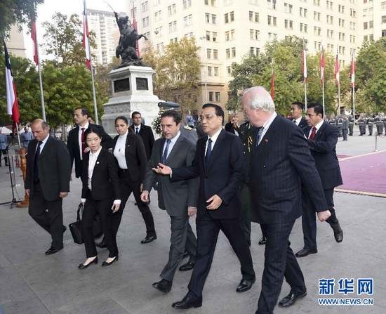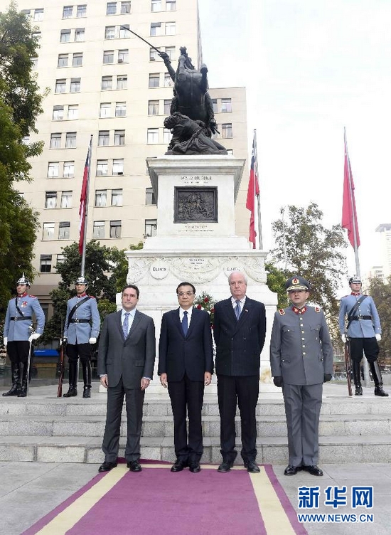 当地时间5月25日,中国国务院总理李克强在圣地亚哥向奥希金斯纪念碑敬献花圈。 新华社记者 张铎 摄