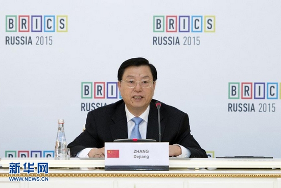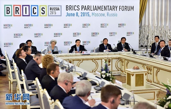 6月8日,金砖国家议会论坛在莫斯科举行。中国全国人大常委会委员长张德江出席并讲话。 新华社记者李涛摄