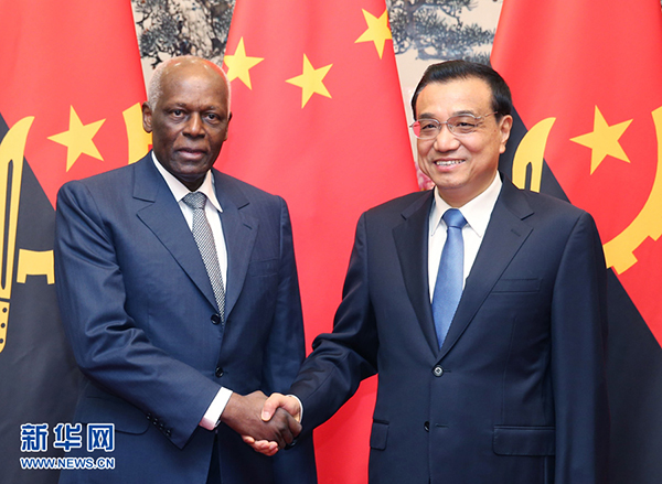 6月9日,国务院总理李克强在北京人民大会堂会见来华进行国事访问的安哥拉总统多斯桑托斯。 新华社记者 姚大伟摄